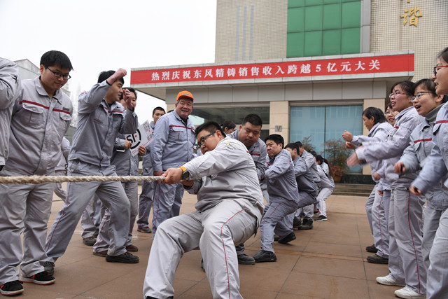 19日上午9時18分,公司在和鼎廣場舉行了銷售收入跨越五億元慶祝儀式。首先,杜孔明總經理致辭,熱烈祝賀東風精鑄銷售收入跨越五億元大關;隨后,公司銷售人員代表誓師,黨委書記孫長虹向銷售總部授予“邁向八億”戰旗;慶祝儀式上,與會員工在印有“倡導精益,打擊陋習” 倡議書的噴繪上簽字,表達堅決與陋習告別的決心。慶祝活動還進行了喜慶歡樂的拔河比賽。