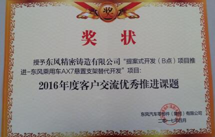 東乘AX7懸置替代開發項目榮獲零部件集團2016年度客戶交流優秀推進課題
